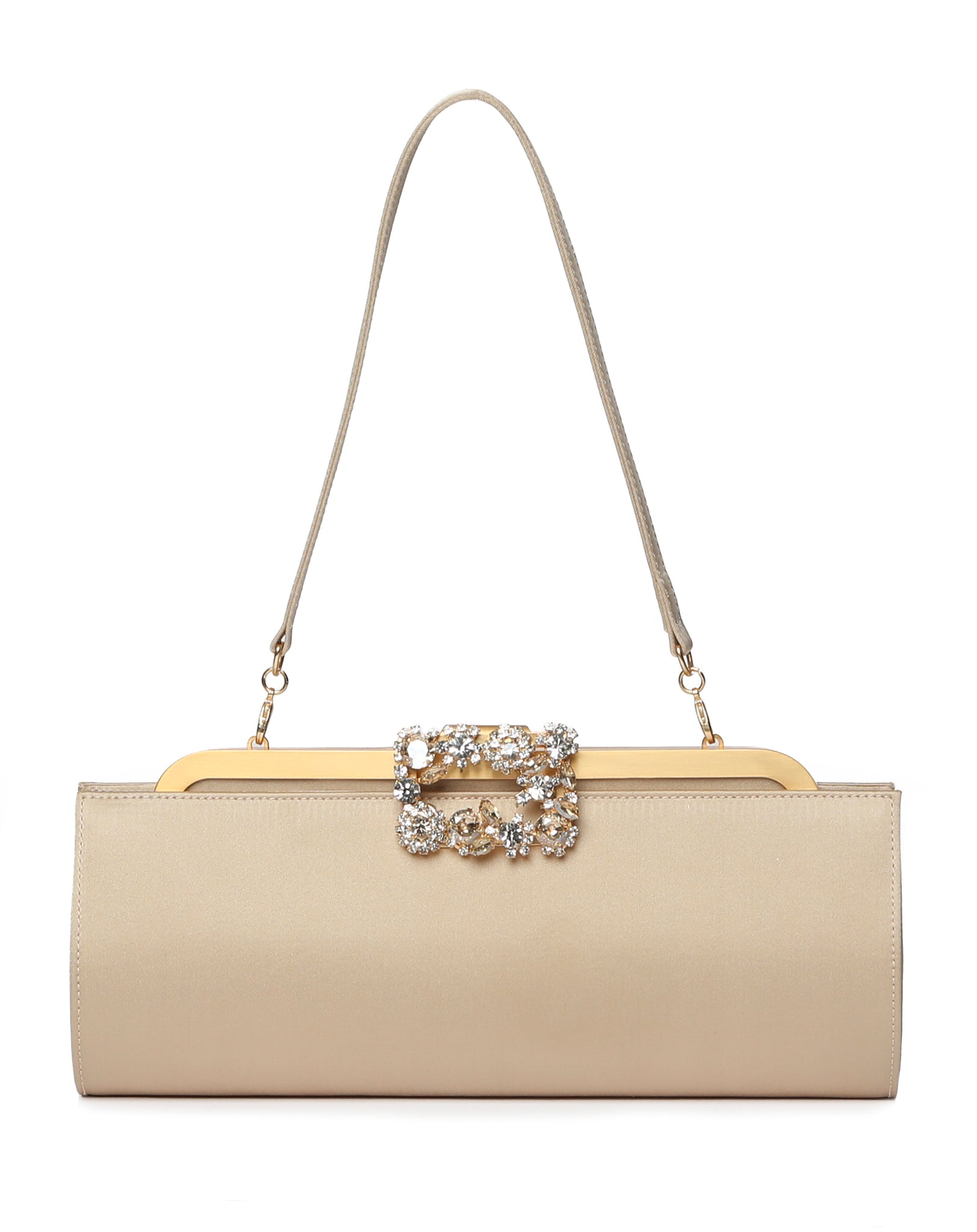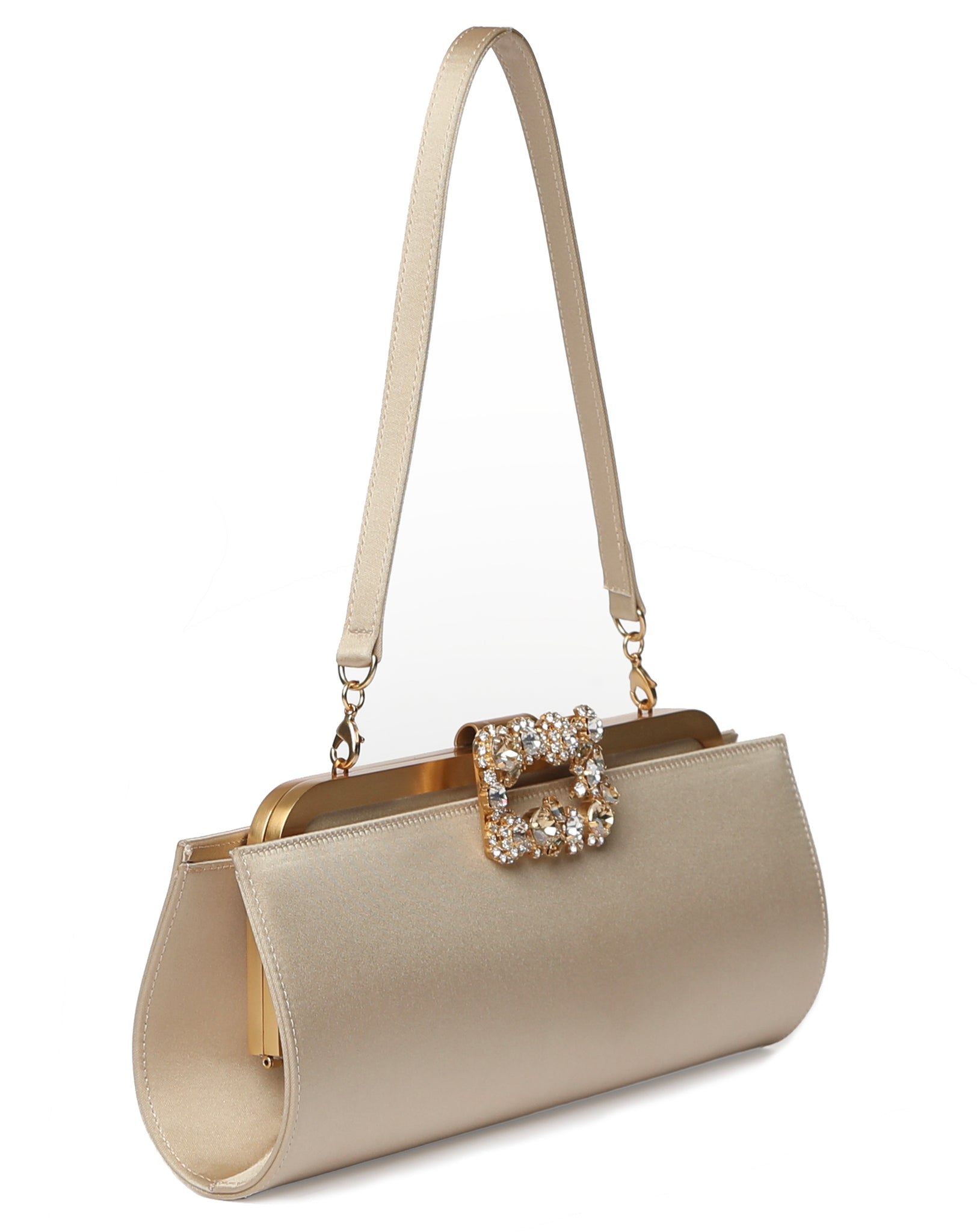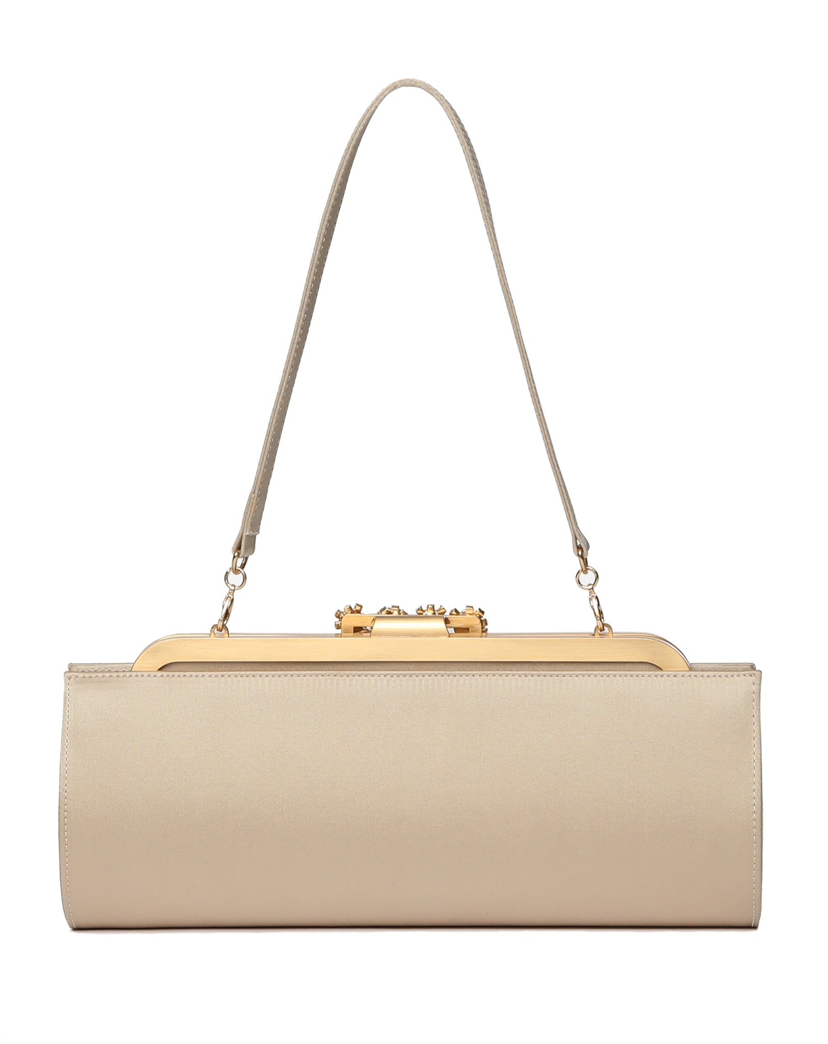 Crafted from luminous satin, NAJAT is defined by its elongated East-West silhouette and brass frame. The frame closure opens by gently lifting the crystal-embellished buckle — a jewellery-inspired detail that adds subtle brilliance while honouring DANIA SHINKAR’s signature attention to detail.