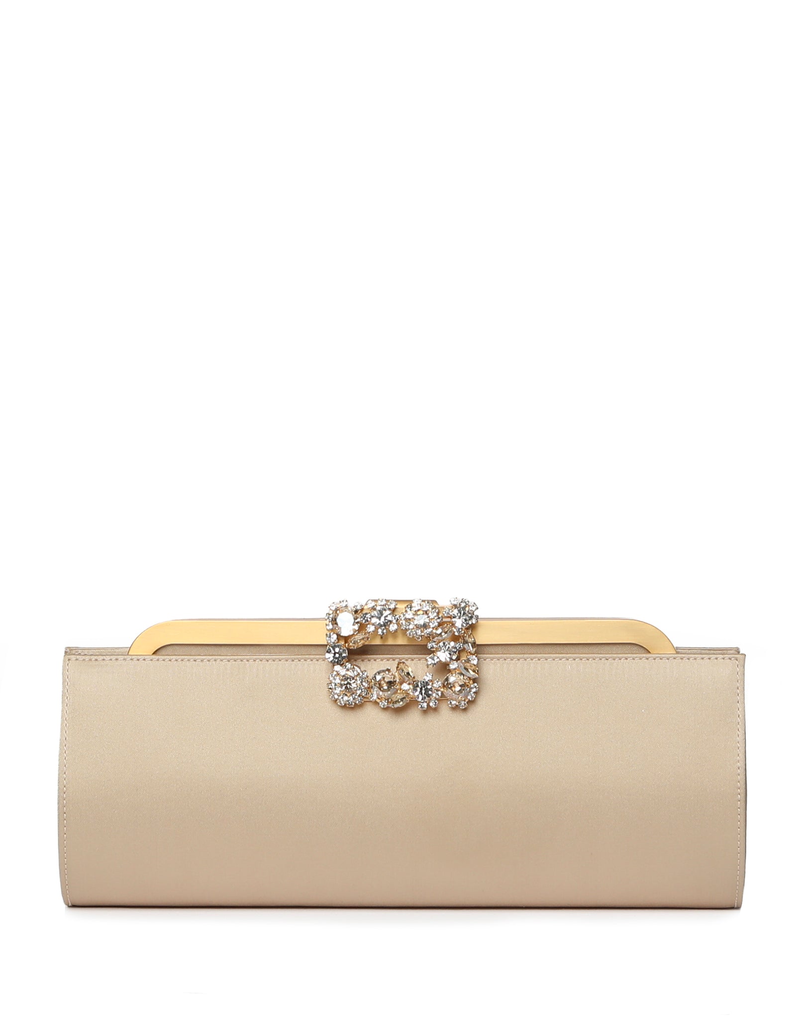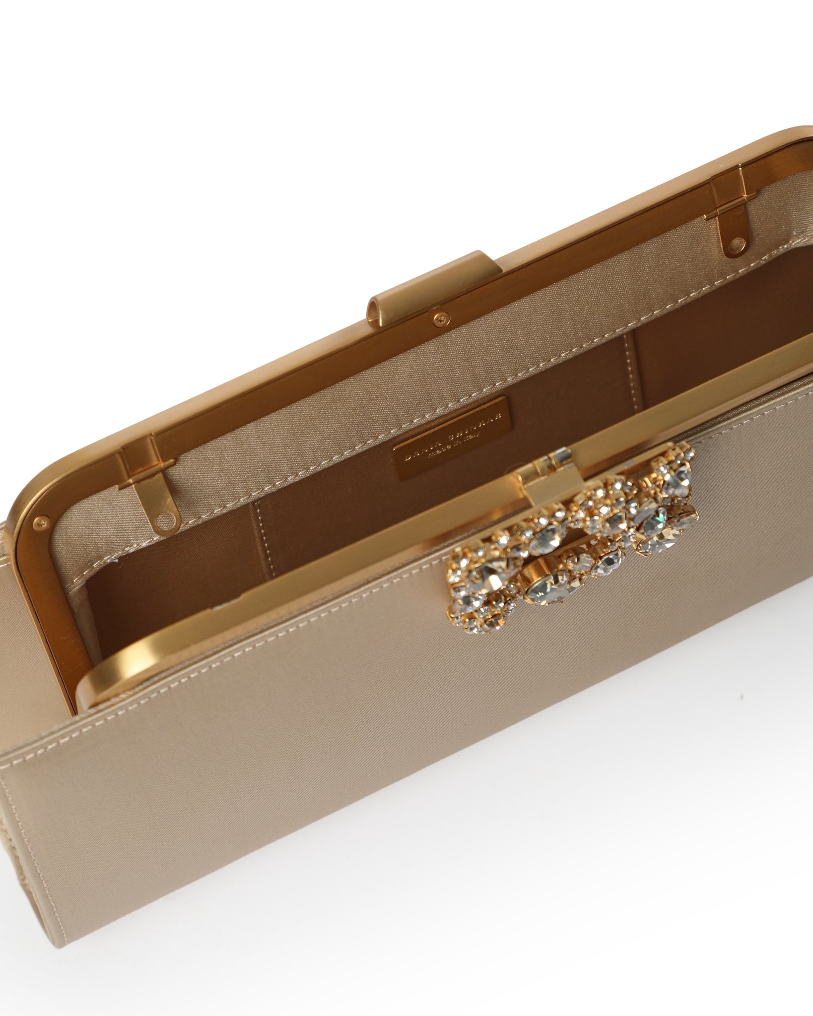Made in Italy, this variant is crafted from light-gold satin and finished with a gold-tone frame. It is perfectly sized to fit your phone, lipstick, and evening essentials.