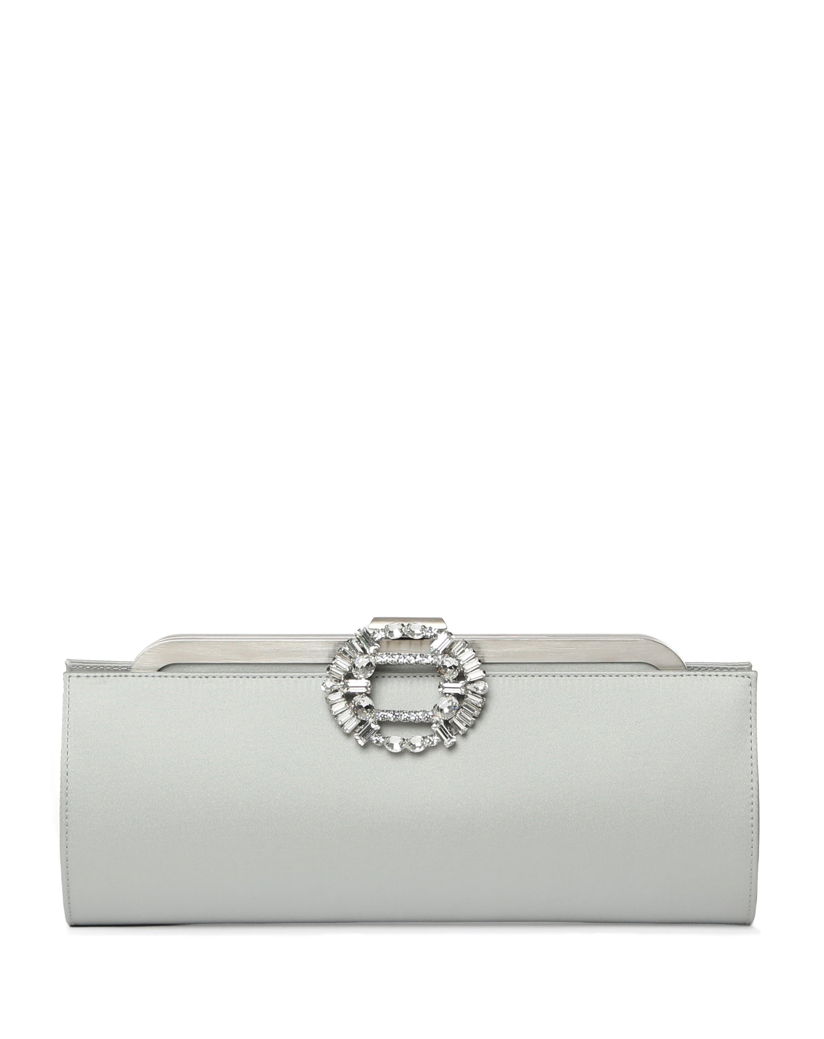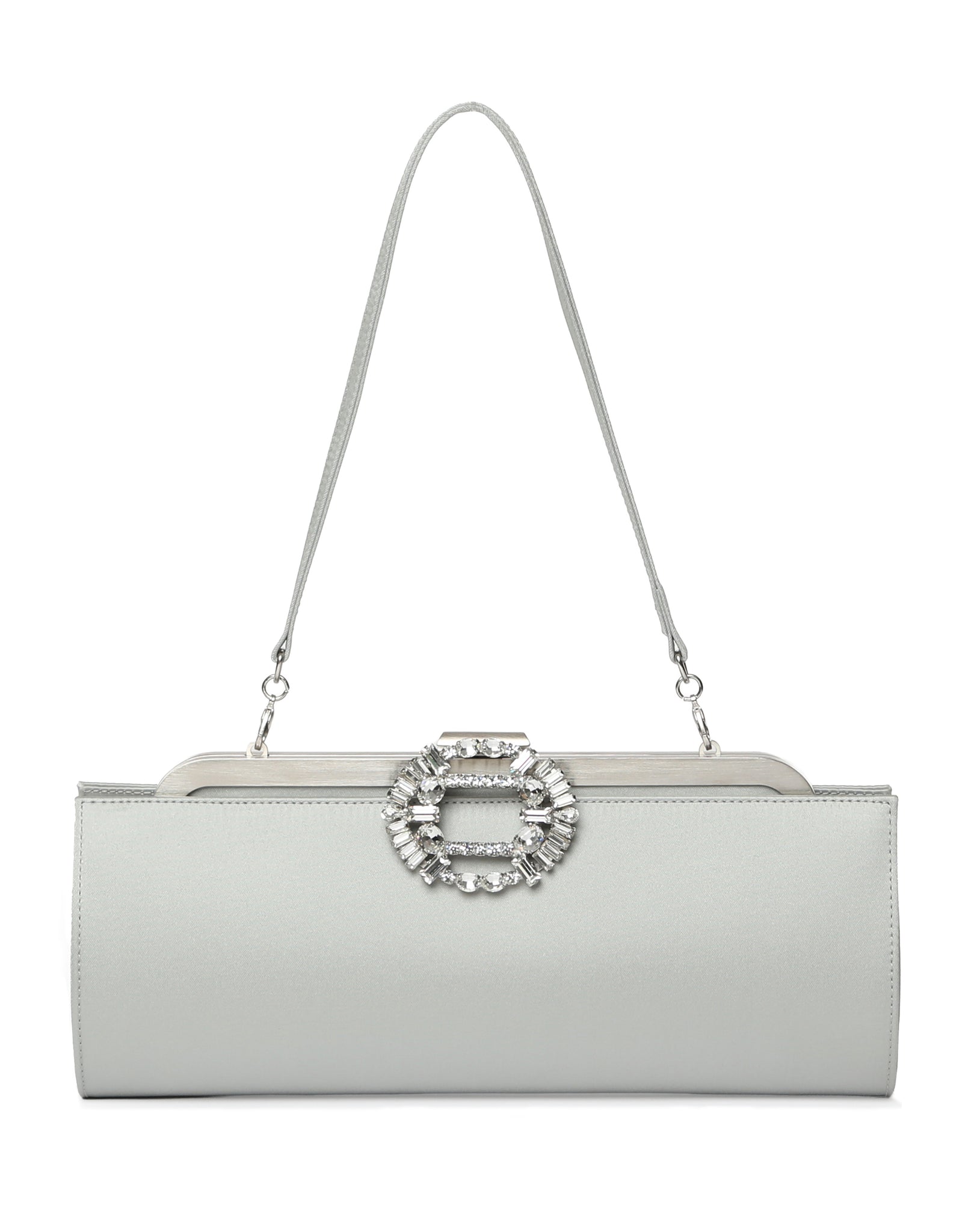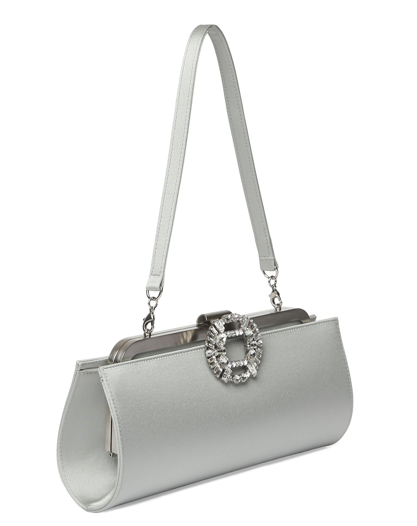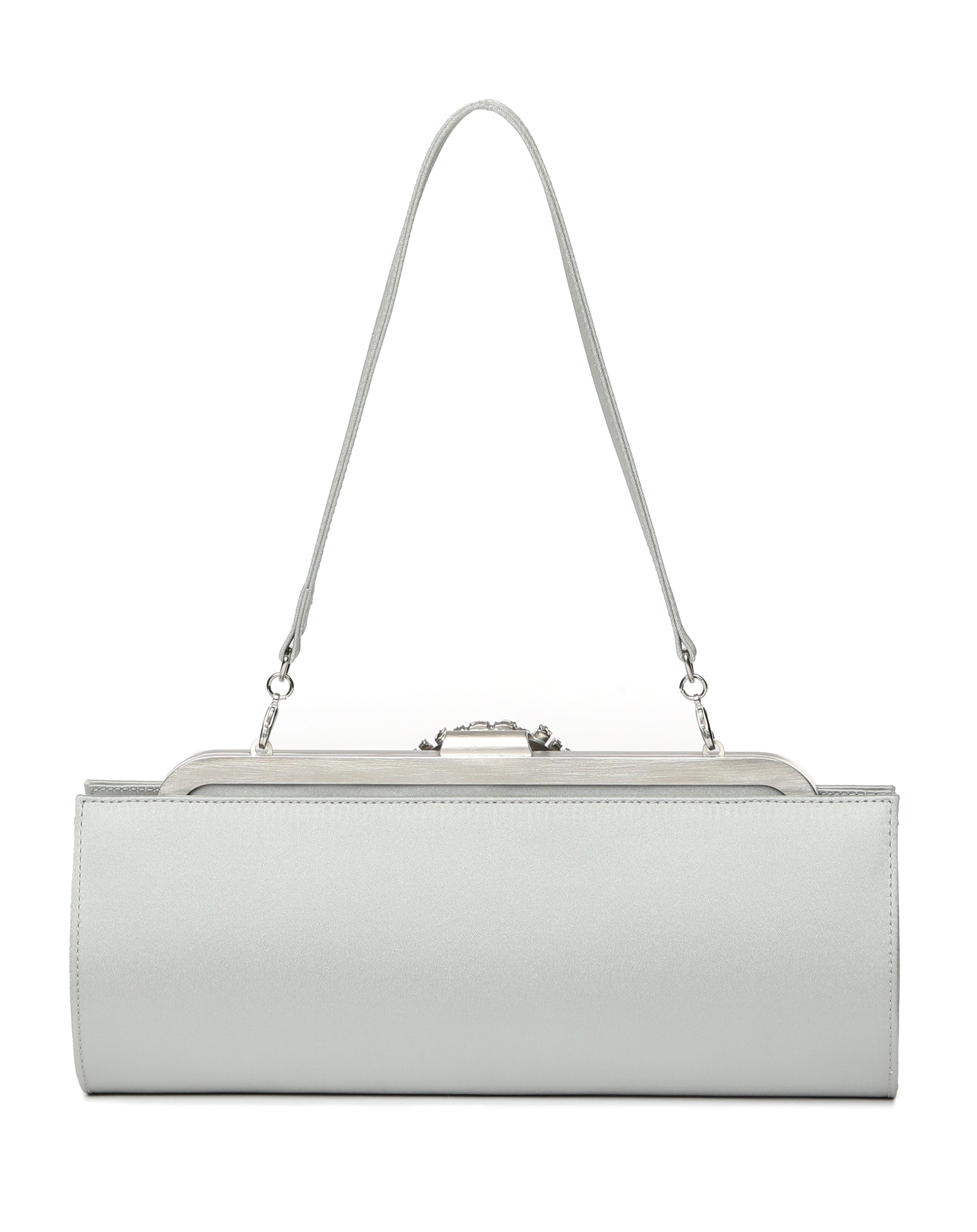Made in Italy, this variant is crafted from silver satin and finished with a silver-tone frame. It is perfectly sized to fit your phone, lipstick, and evening essentials.