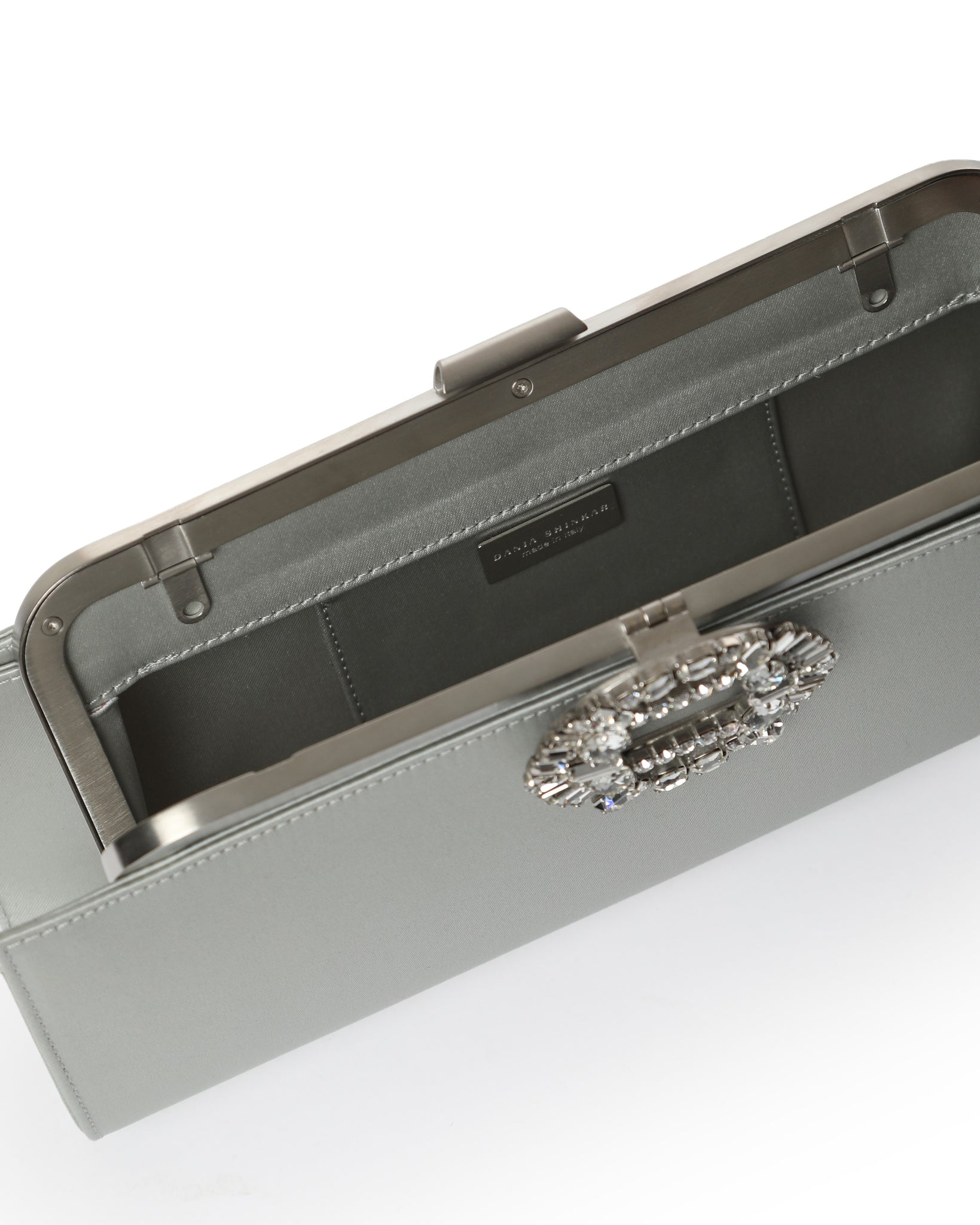Crafted from luminous satin, NAJAT is defined by its elongated East-West silhouette and brass frame. The frame closure opens by gently lifting the crystal-embellished buckle — a jewellery-inspired detail that adds subtle brilliance while honouring DANIA SHINKAR’s signature attention to detail.